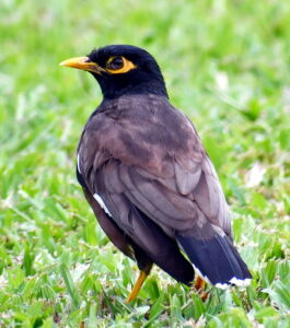 Native to India, myna birds were introduced to Hawaiʻi is 1865 to eat insect pests. The birds also eat fruit and scraps. ©Susan Scott