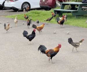 Shown here are the well-known chickens of Kōkeʻe State Park on Kauaʻi. These are hybrids of Red Junglefowl and domestic stocks. © Susan Scott