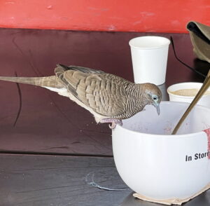 Are you going to finish that? A Zebra Dove noticing foam left in a cappuccino. (Island Vintage Coffee, Haleʻiwa.) Susan Scott