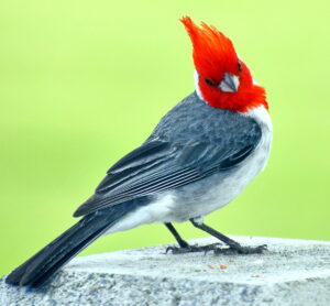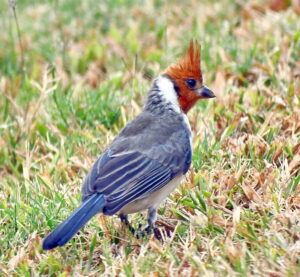 Immature Red-crested Cardinals have brown heads. Introduced to Oahu around 1930, the species is now common throughout the lowlands of the main Hawaiian Islands. ©Susan Scott